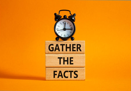 Gather the facts symbol. Wooden blocks with words Gather the facts. Beautiful orange background with alarm clock. Business and Gather the facts concept. Copy space.