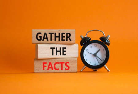Gather the facts symbol. Wooden blocks with words Gather the facts. Beautiful orange background with alarm clock. Business and Gather the facts concept. Copy space.