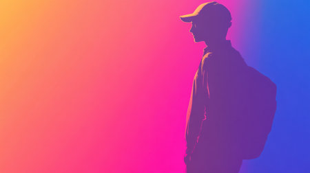 A delivery worker stands silhouetted against a vivid abstract background with gradients and neon colors, creating a dynamic and energetic atmosphere.