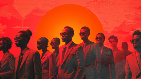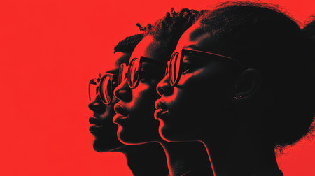 An engaging composition features African American and black people of different ages, set against a striking red backdrop, capturing diversity and vitality in an artistic way.