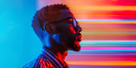 Man Immersed in Vibrant Neon Lights with Digital Reflections.