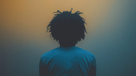 A lone figure stands in contemplation, surrounded by a hazy backdrop of warm and cool colors at twilight.