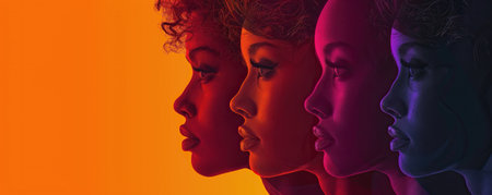 Multiple colorful silhouettes of women highlight unique hairstyles, blending seamlessly into a bright orange and yellow backdrop.