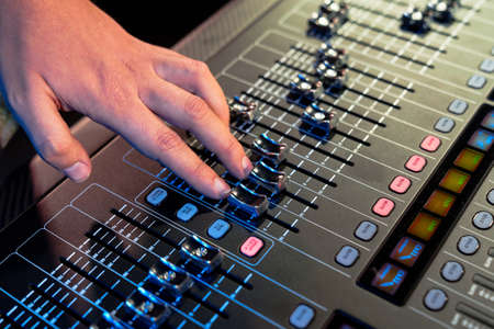 Close up audio engineer working with panel mixer control in music recording studio