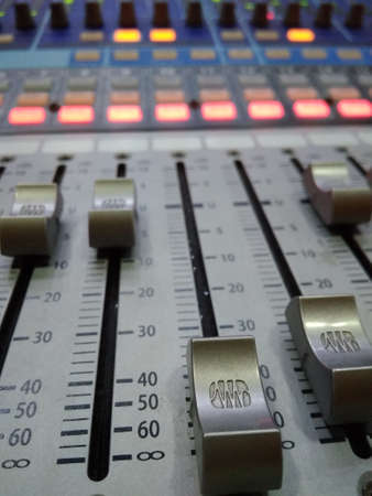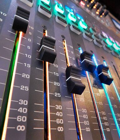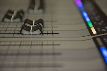 Audio mixer control panel with sliders. Audio mixer in blur.