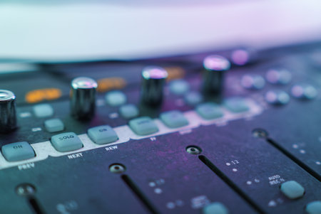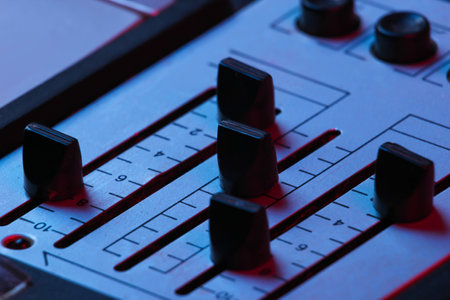 Closeup mixing faders and knobs as seen from above side angle, artistic studio equipment concept.