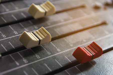 volume fader slider knobs on an audio mixing board close up