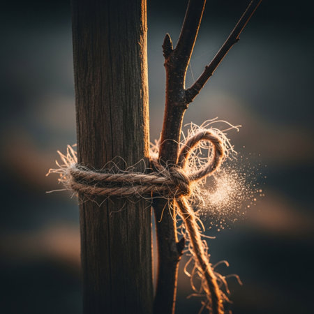 Rope tied with twine in a vineyard in sunset light
