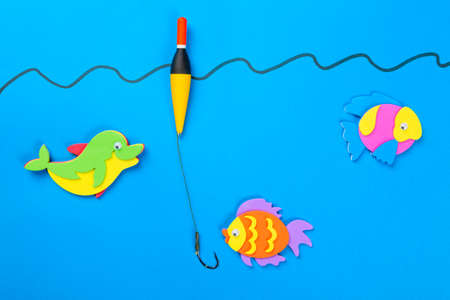 Fishing concept. Colorful toy fish with a hook and fishing buoy on blue background