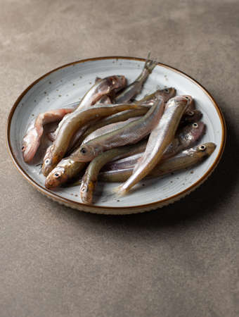Small raw fish, snetok or smelt on a plate. Close-up, vertical view