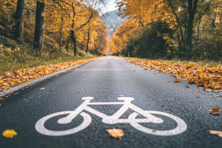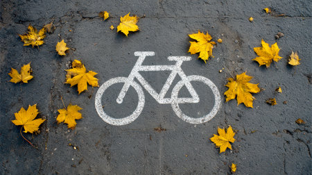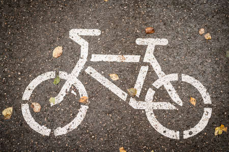 drawn symbol bicycle on an asphalt bicycle path with markings strewn with yellow leaves on a sunny autumn day, close-up of a road sign on the ground, nobody.