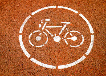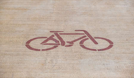 Bike lane concept. Bicycle red sign on beige asphalt path. Priority safety pathway for bicyclist. Healthy lifestyle with activities, sport