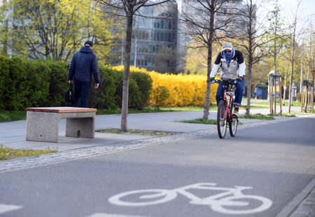 Warsaw, Poland, April 16, 2020: Warsaw during first day with hiding nose and mouth restriction during corona virus quarantine, bikers