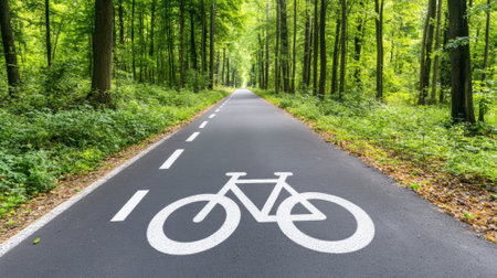 An artistic perspective of a bicycle lane in an urban setting, with colorful bike markings on the road, emphasizing eco-friendly transportation options.