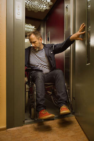 Disabled man on wheel chair using elevator in apartment house