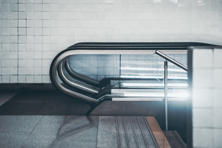 Side view of modern glass and chrome escalator in urban underground with white tiles in background; city contemporary moving staircase with stairs next to it following down into subway