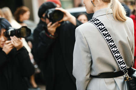 Milan, Italy - February 21, 2019: Street style – Fendi handbag detail before a fashion show during Milan Fashion Week - MFWFW19