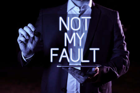 Conceptual caption Not My Fault. Conceptual photo To make excuses to avoid being accused for a mistake error Hand With Pen Pointing Important Infortmations With Other Holding Tablet