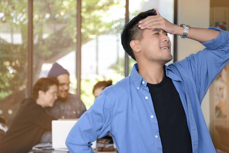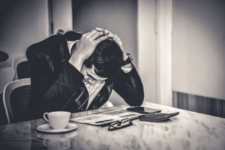 asian businessman sad worry tired and headache, stress at workplace, feeling ill, finance problem and lost job, close up shot background