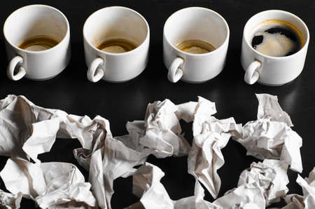 business creativity concept empty and full cups of fresh espresso with crumple wads on desk