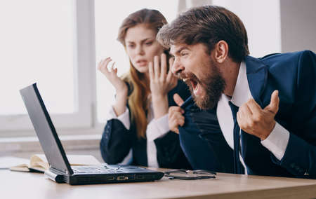 Image of Frustrated stressed business man and graph business with computer laptop in the workplace.