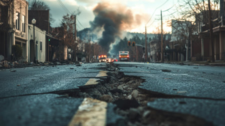 A striking urban scene captures the aftermath of a powerful earthquake, showcasing cracked roads and smoke billowing from distant fires, signaling urgency.