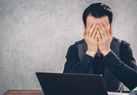 The businessman was putting his hands on his face, who was disappointed in the failure of the business.