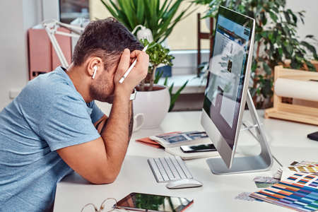 Tired photographer works in Photo Editing App. Software on His Personal Computer.Photographer for processing photos. Photographer equipment on the table. Retouching photos.