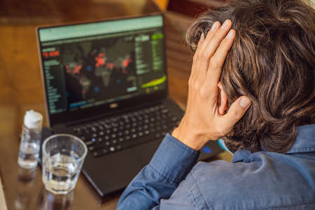 Coronavirus. A man looks at a map of the coronovirus. Working from home wearing protective mask. quarantine for coronavirus wearing protective mask. Working from home