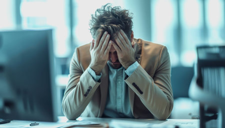 Stressed businessman in beige suit covering face at desk in bright, modern office
