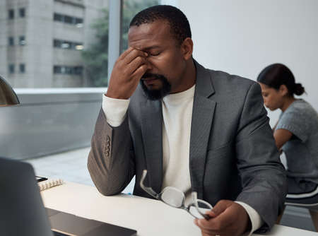 A meeting really isnt what I want now. Shot of a young businessman experiencing a headache at work.