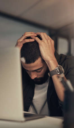 Stress is a sign that something needs to change. a young businessman feeling stressed while working late at night in a modern office.
