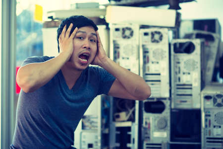 Man in blue t shirt feel a despair while working an overtime at light office.