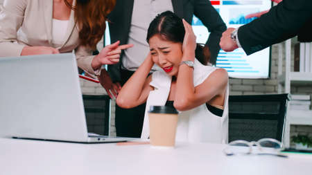 A stressed Asian man sits at his desk with his hands on his head, surrounded by messy papers, while a group of diverse colleagues stands behind him, laughing and pointing. The image depicts workplace bullying, mobbing, or being the subject of a joke.