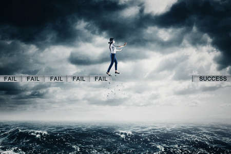 Blindfold businesswoman walking on the bridge with fail word toward success flag on the sea