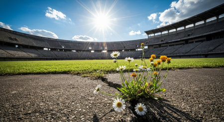 Field of daisies in front of an empty stadium with sun