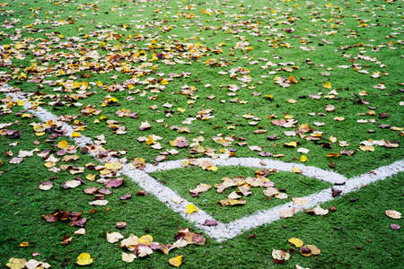part of a football field with artificial turf with fallen leaves
