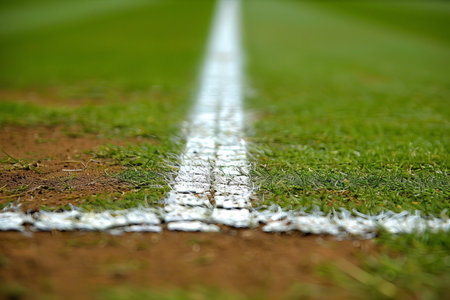 A detailed close-up view of a baseball field highlighting the vibrant green grass and crisp chalk line creating a picturesque pathway to the outfield.