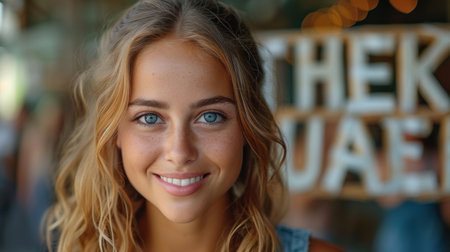 A captivating close-up portrait showcasing a young woman with freckles and long hair. Her expressive eyes and serene smile shine brightly against a natural backdrop.