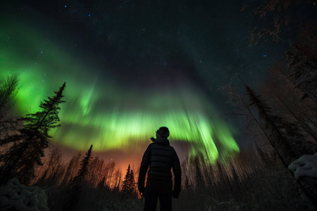Woman admiring northern lights vibrant green and purple sky silhouetted pines look of wonder