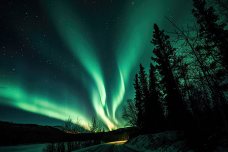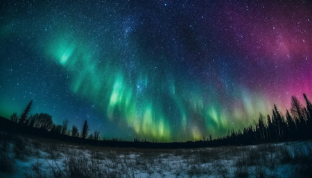 An AI generated illustration of a night sky illuminated by the vibrant colors of the Aurora Borealis