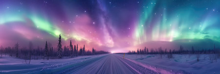 A winter road stretching through a snowy landscape, illuminated by the mesmerizing glow of the northern lights in the background. This breathtaking scene combines the tranquility of winter with the magic of the aurora, perfect for seasonal or nature-inspired designs.