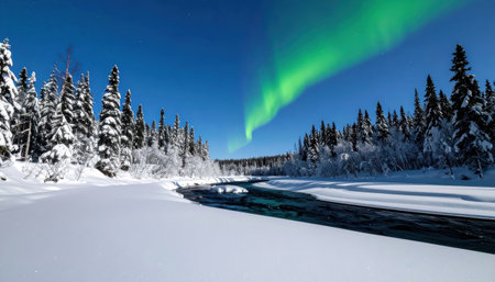 Aurora curtains dance above a boreal forest and frozen river bend under moonlight clean polar scene with crisp stars and open copy space