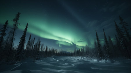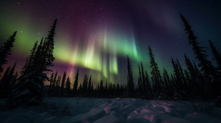 snowy forest illuminated by aurora borealis, created with generative ai