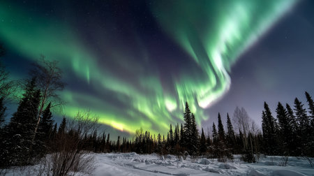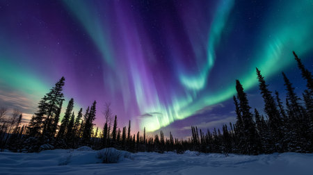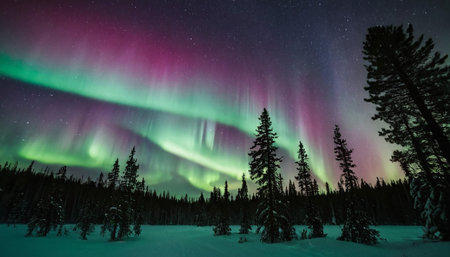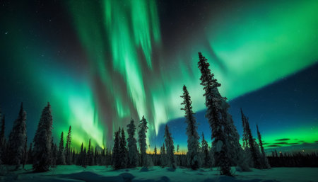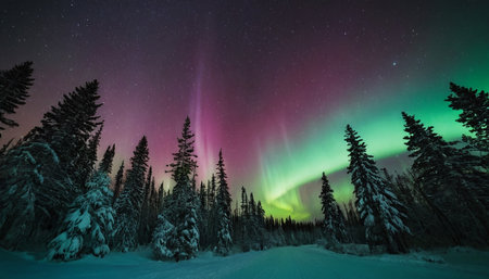 Discover the enchanting beauty of the northern lights illuminating a snowy pine forest, creating a breathtaking scene under a star-filled night sky.