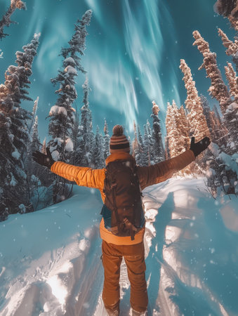 Backpacker celebrates under dancing aurora in snowy pine forest. AI-generated.