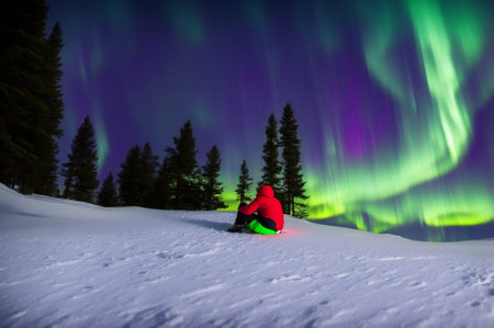 A person is sitting in the snow and looking up at the sky. The sky is filled with green and purple lights, creating a beautiful and serene atmosphere