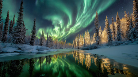 Experience the breathtaking beauty of the northern lights illuminating a snowy winter landscape above a tranquil river. The colorful reflections create a magical atmosphere, perfect for nature lovers and outdoor enthusiasts.
