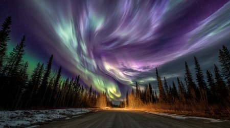 Experience the breathtaking beauty of the northern lights illuminating a tranquil forest road, surrounded by vibrant colors and starry skies.