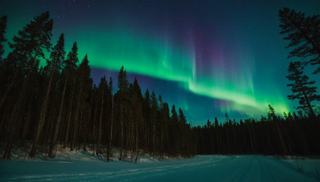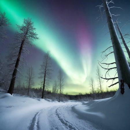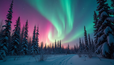Magical aurora borealis display above a snowy forest path.